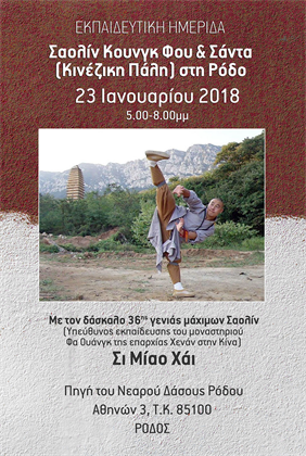 Ολοκληρώθηκε η εκπαιδευτική ημερίδα που διοργάνωσε η "Πηγή του Νεαρού Δάσους" Ρόδου, με εισηγητή τον 36ης γενιάς Μάχιμων Σαολίν - Υπεύθυνο εκπαίδευσης του μοναστηριού Φα Ουάγκ της επαρχίας Χενάν της Κίνας, Μιάο Χάι με αφορμή την επίσκεψή του στη χώρα μας. Αντικείμενο ήταν η παραδοσιακή μορφή σκιαμαχίας "Τα 18 χέρια του διαφωτισμένου" Λούο Χαν Σίπα Σόου 罗汉十八手 (Luo Han Shiba Shou)"  καθώς και η εκμάθηση βασικών τεχνικών της Κινέζικης Πάλης "Σάν Τα"